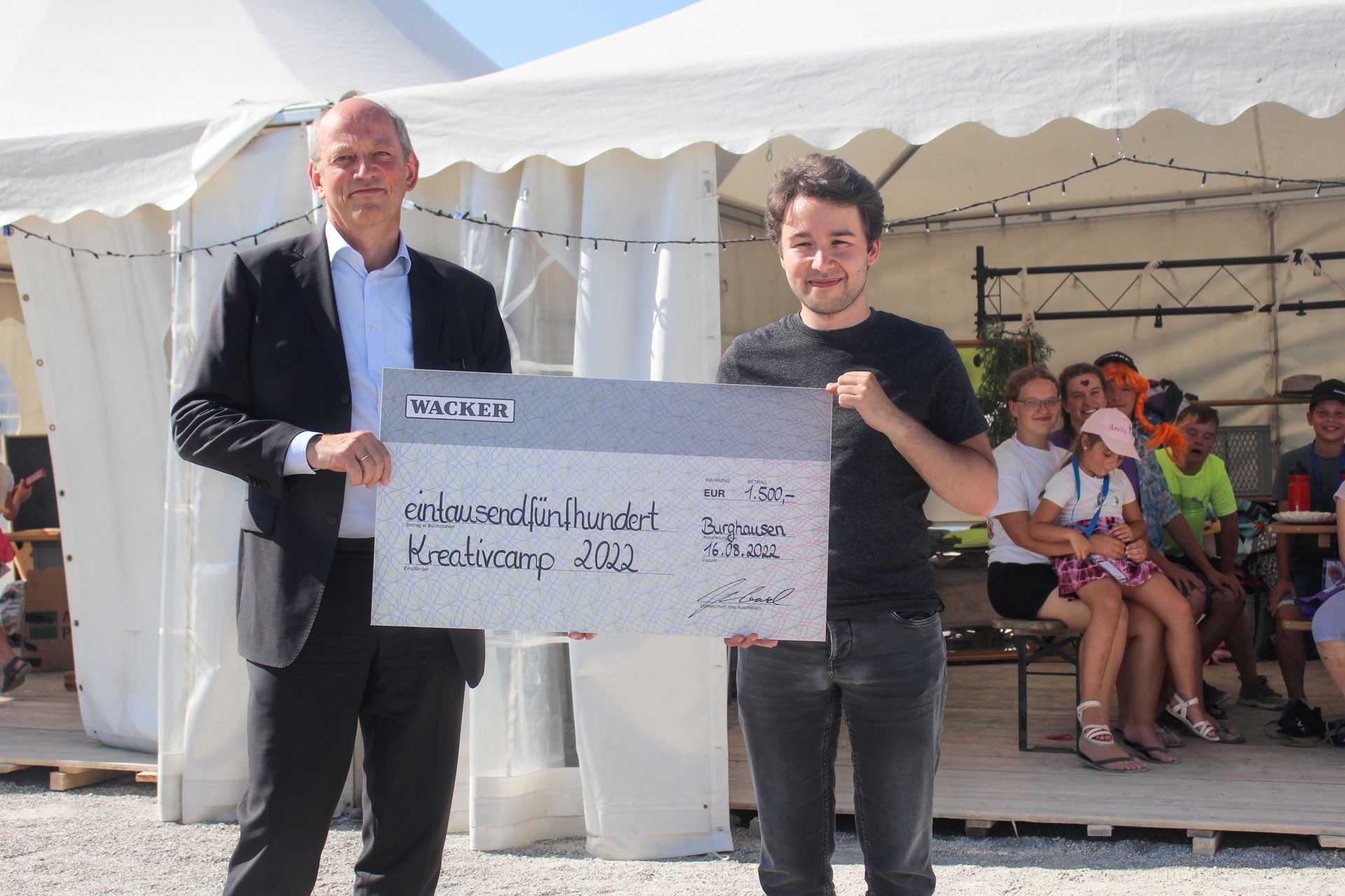 Die Wacker Chemie hat 1.500 Euro an das Kreativcamp Burghausen gespendet, das der Förderverein in Zusammenarbeit mit dem Burghauser Jugendbüro und dem Freizeitheim veranstaltet hat. „Mit dem Geld haben wir unter anderem die Zeltleihgebühren bezahlt, Verpflegung für die Helfer und Kinder, sowie Materialien für unsere Werkstätten gekauft.“ Das Kreativcamp ist Teil des Ferienprogramms und fand auch heuer wieder für zwei Wochen im August statt. In den zehn Camp-Werkstätten, die mit der Unterstützung von rund 50 ehrenamtlichen Betreuern gestaltet und betrieben wurden, konnten 240 Kinder ihrer Kreativität freien Lauf lassen. Zu den Werkstätten zählten unter anderem ein Atelier, ein Zirkus, ein Theater- und ein Kochzelt. Die Forscherwerkstatt hatte es dem WACKER-Werkleiter dabei besonders angetan: „Hier forschen unsere potenziellen Mitarbeiterinnen und Mitarbeiter von Morgen“, sagte er. „Wir freuen uns sehr, dass wir das Burghauser Kreativcamp finanziell unterstützen konnten. Denn Spenden, die unseren Kindern zugutekommen, sind direkte Investitionen in die Zukunft.“
