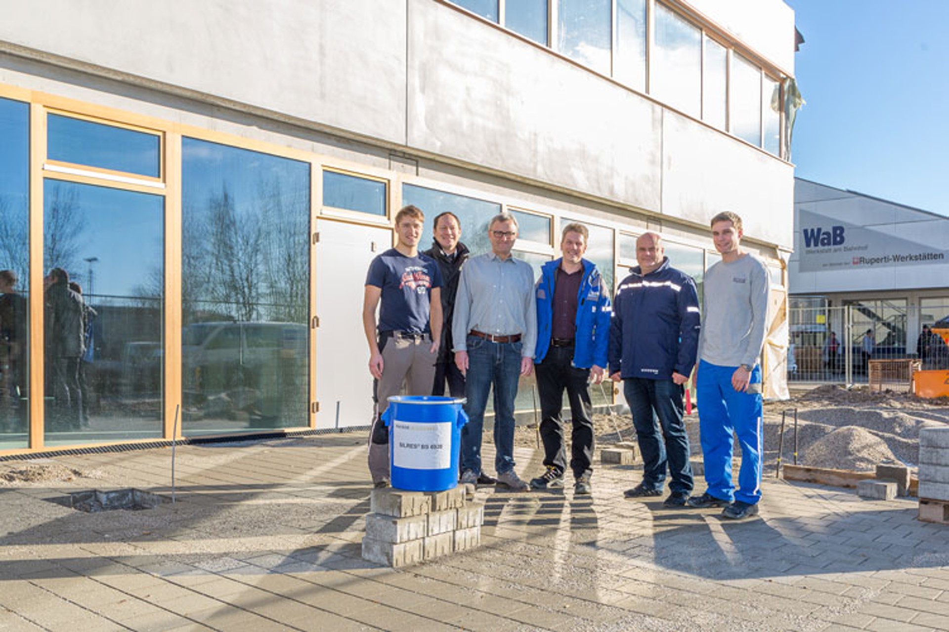 Noch im April dieses Jahres soll der erste Bauabschnitt des neuen Gebäudes bezugsfertig sein. Die Arbeiten laufen auf Hochtouren. So werden aktuell in den neuen Produktionsräumen und Werkstattflächen die Betonböden eingezogen. Damit dieser besonders strapazierfähig und langlebig bleibt, stellte WACKER den Ruperti Werkstätten über einhundert Kilogramm des dünnflüssigen Bindemittels SILRES® BS 6920 als Sachspende zur Verfügung und unterstützte beim Auftragen vor Ort.
