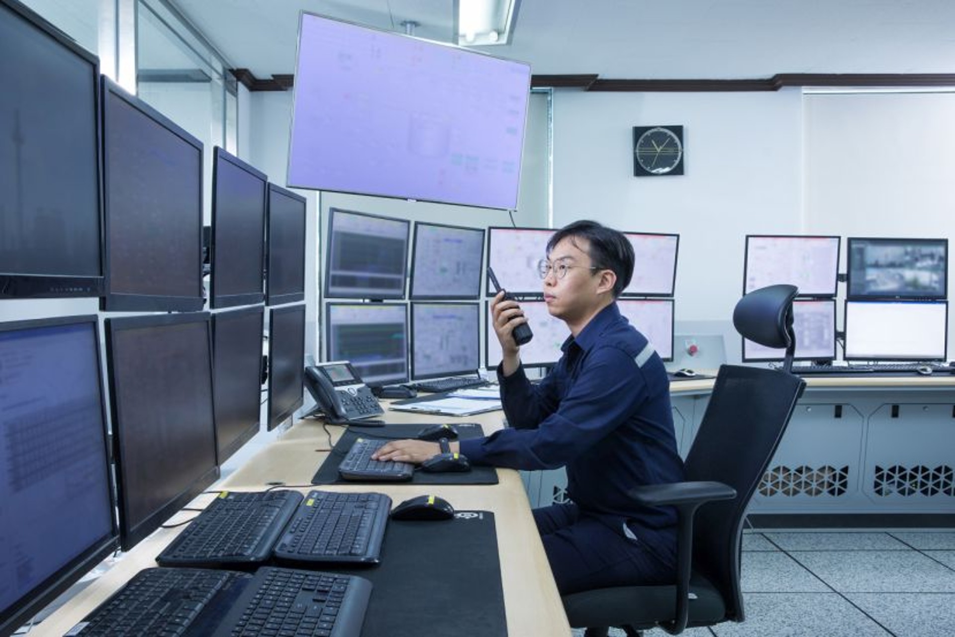 Ein technischer Mitarbeiter überwacht die Produktion in der Messwarte.