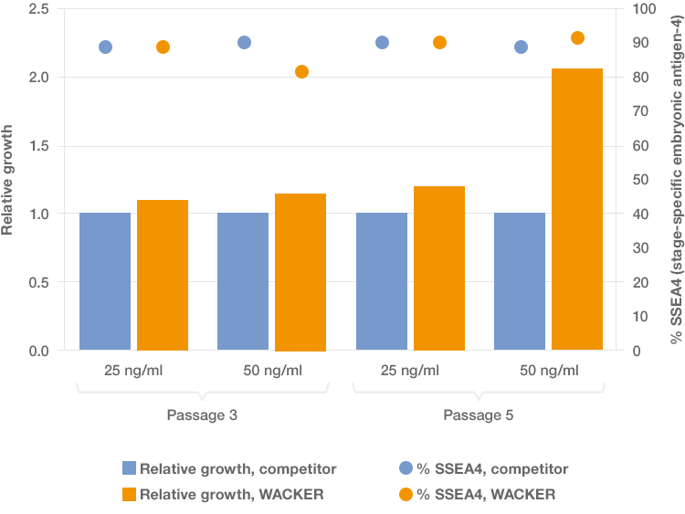 Beim Vergleich des relativen Wachstums boviner Stammzellen zeigen beide Passagen, dass die Lösung von WACKER dem Wettbewerbsprodukt sowohl bei 25 ng/ml als auch bei 50 ng/ml überlegen ist.