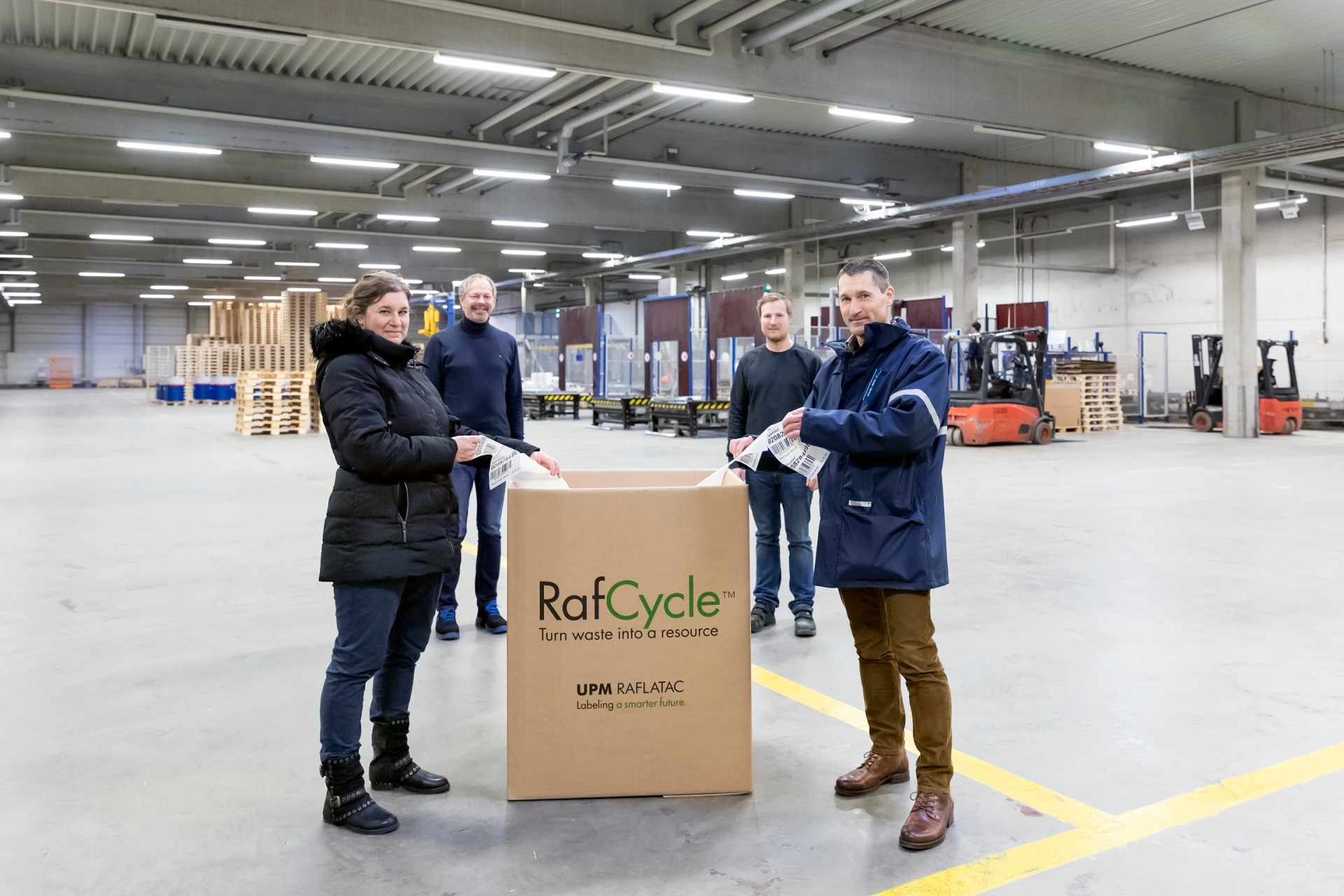 Nina Straubhaar (vorne links), Dr. Markus Haider (vorne rechts), Wolfgang Huber (hinten links) und Markus Heindlmeier zeigen einen Sammelcontainer für Trägerpapiere von Etiketten.