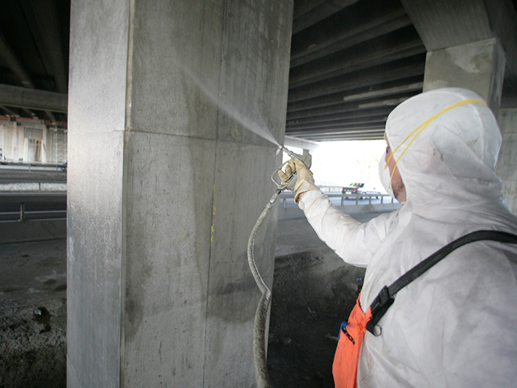 Der Brückenpfeiler einer deutschen Autobahnbrücke wird hydrophobiert durch Aufsprühen eines SILRES® BS Hydrophobierungsmittels.
