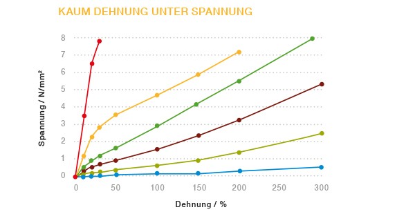 Spannungs-Dehnungs-Diagramm mit den Kurven verschiedener Typen aus der Reihe ELASTOSIL® LR 3003 inklusive der 90-Shore-Type (rot). Diese dehnt sich unter Spannung kaum.