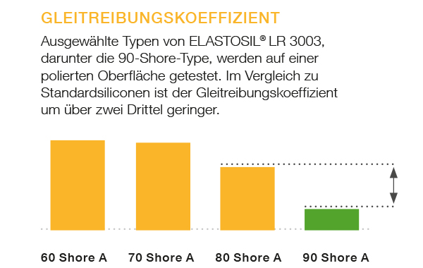 Der direkte Vergleich der Reibungskoeffizienten von ELASTOSIL® LR 3003-Produkten unterschiedlicher Härte verdeutlicht den sehr niedrigen Reibungskoeffizienten von ELASTOSIL® LR 3003/90.