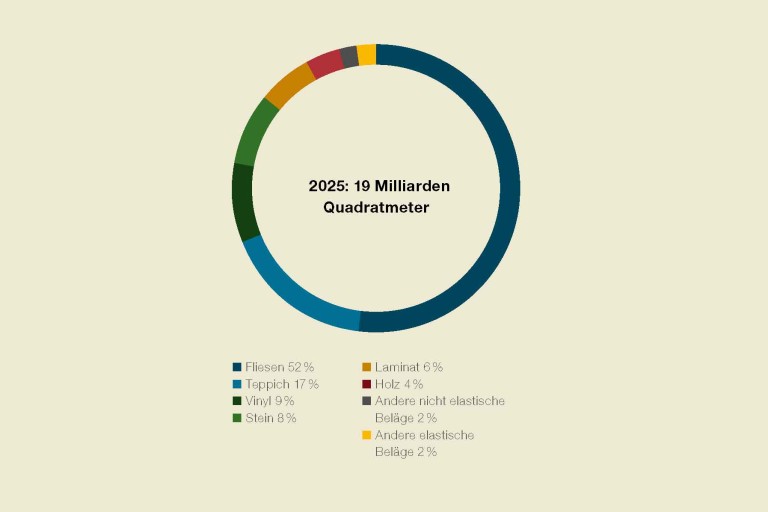 Weltweit bestehen schon heute etwa 50 Prozent aller Bodenbeläge aus Fliesen – mit steigender Tendenz bis zum Jahr 2025. Erst mit weitem Abstand folgt Teppichboden auf Platz zwei.
