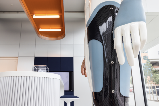 Ein weiteres Highlight-Exponat zum Anfassen ist unser lebensgroßes Modell mit Oberschenkelprothese : Gefertigt aus biokompatiblen ELASTOSIL® Siliconelastomeren steigern solche Prothesen die Mobilität und Lebensqualität beträchtlich. Davon, wie lebensecht eine solche Prothese aussieht und wie angenehm sie sich anfühlen kann, können Sie sich im WACKER Showroom überzeugen.