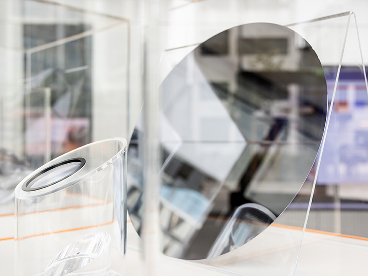 Wer weiterschaut, wundert sich vielleicht über einen Glaskasten mit glänzend silbrigem Inhalt: Dabei handelt es sich um hochreines Polysilicium , das wir bei WACKER in weltweit führender Menge und Reinheit herstellen. Wafer aus unserem Polysilicium ermöglichen z.B. die Herstellung von Chips im Bereich der künstlichen Intelligenz, Serveranwendungen, Datenspeicher und des autonomen Fahrens. In unserem Showroom haben Sie Gelegenheit, einen solchen Mikrochip einmal wortwörtlich unter die Lupe zu nehmen.