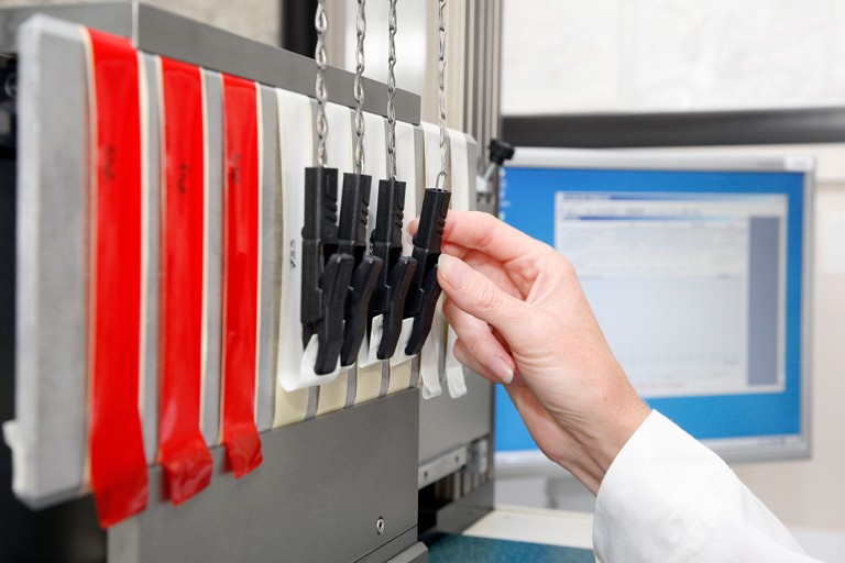 Im Labor des DEHESIVE® Coating Center ermitteln WACKER-Techniker die Trennkraftprofile von verschiedenen Beschichtungen mit den in der Branche üblichen Prüfverfahren.