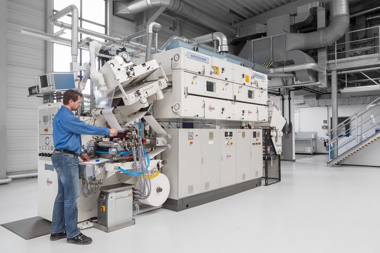 Die Pilotbeschichtungsanlage im neuen DEHESIVE® Coating Center in Burghausen: Auf 380 Quadratmetern simulieren die WACKER-Techniker dort industrielle Verarbeitungsbedingungen bei der Silicontrennbeschichtung.