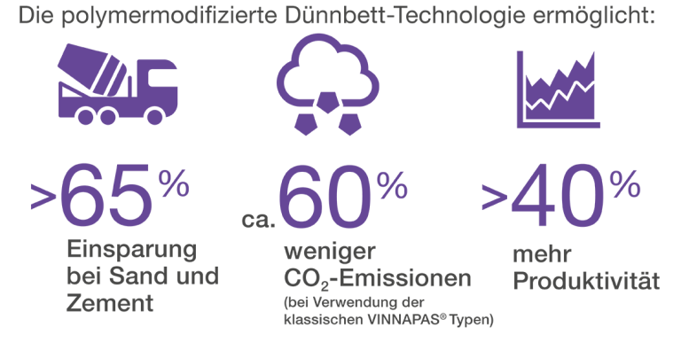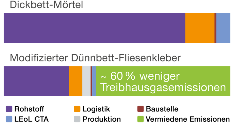 Die Berechnung des CO2-Fußabdrucks basiert auf ISO 14040/44. Es wurde ein VINNAPAS® Vinylacetat-Ethylen (VAE)-Bindemittel in einem C2-Mörtel gemäß EN 12004 verwendet. Das Ergebnis kann aufgrund lokaler Bedingungen variieren. Hier wurde ein europäisches Szenario angenommen. Wenn das fossilbasierte VINNAPAS® Vinylacetat-Ethylen (VAE) durch ein biobasiertes VINNAPAS® eco Produkt ersetzt wird, reduzieren sich die CO2-Emissionen weiter.