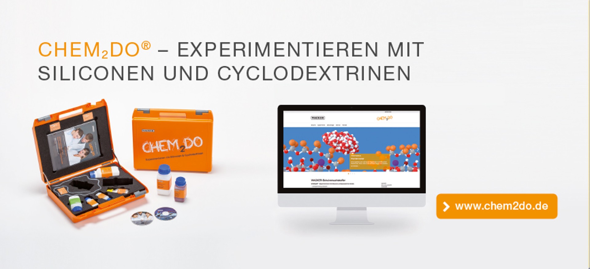 Um die Freude am Fach Chemie zu fördern, bietet WACKER einen Schulversuchskoffer. Er heißt CHEM2DO® – Experimentieren mit Siliconen und Cyclodextrinen. Der Name ist Programm: Die Schüler führen die Versuche selbst durch und werten sie systematisch aus. Animationen zu den zugrundeliegenden chemischen Reaktionen vertiefen das Verständnis. 2.700 Lehrer in Deutschland und Österreich nutzen den Koffer bereits.