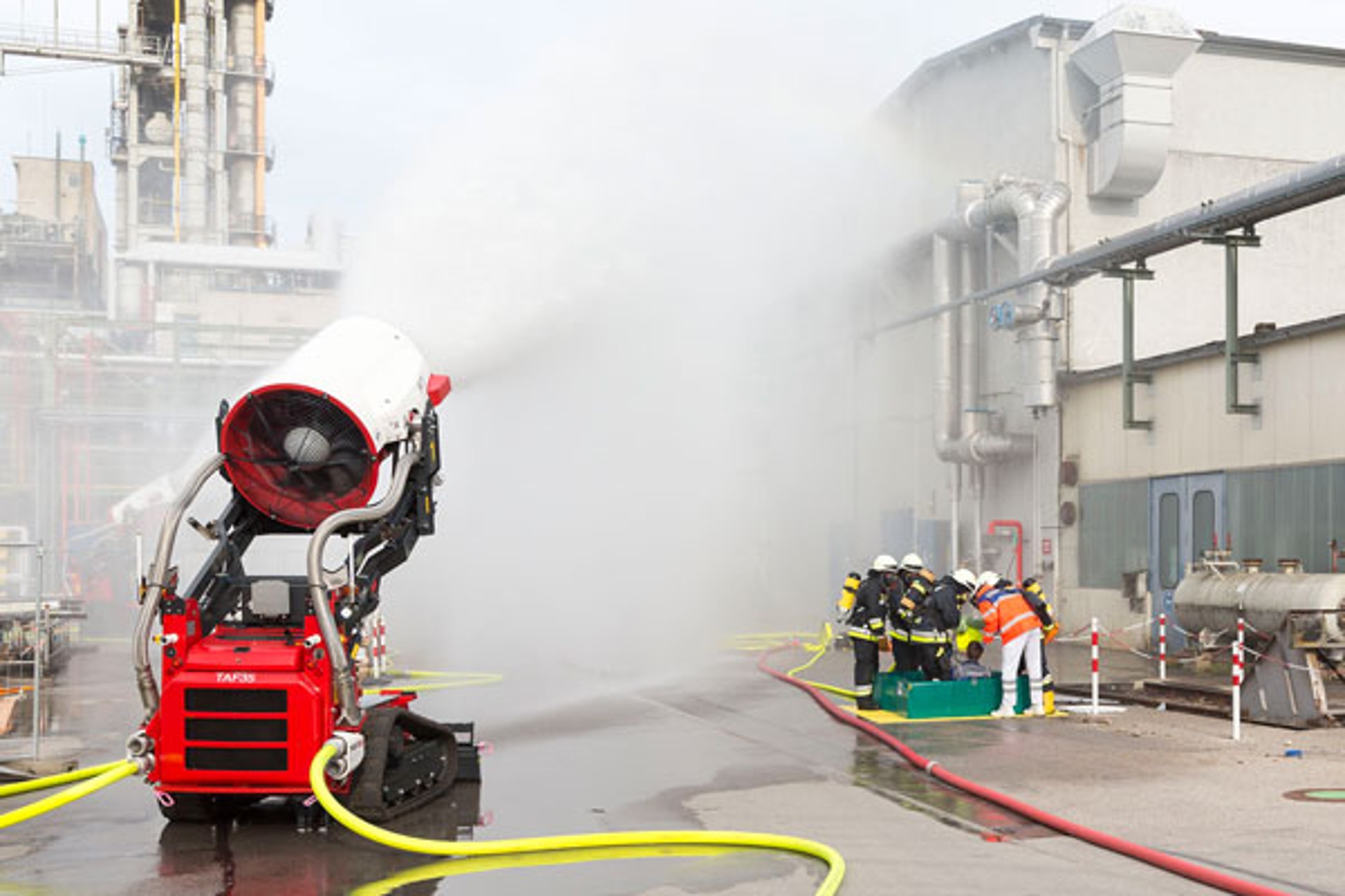 Konzentrierte Zusammenarbeit der Einsatzkräfte bei der Jahreshauptübung der Werkfeuerwehr. Die hochmodernen Turbolöscher kamen ebenfalls zum Einsatz.
