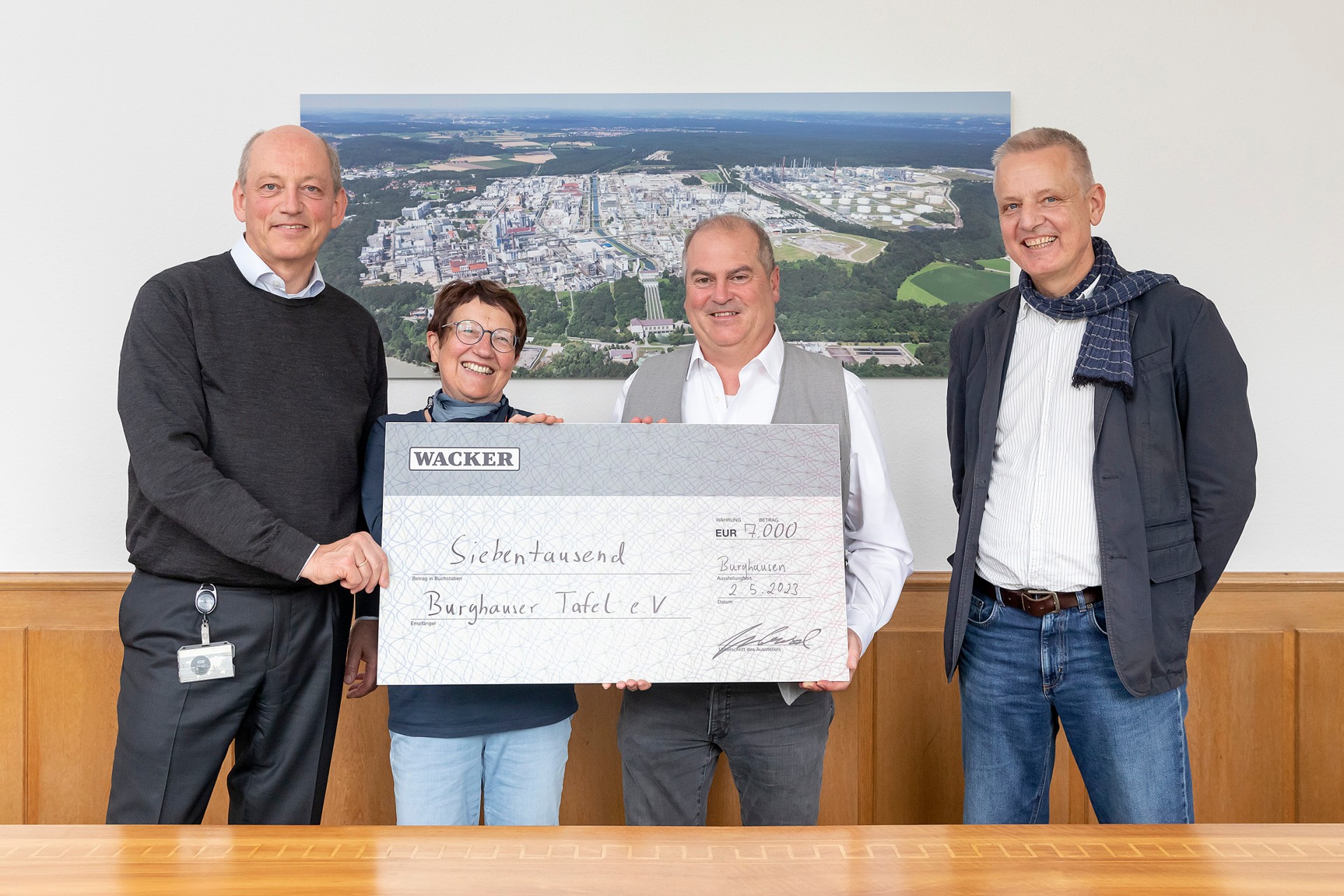 Sie hatten auf einen stolzen Betrag gehofft, doch dass er so hoch ausfallen wird, das hat die Verantwortlichen der Burghauser Tafel dann doch überrascht. 7000 Euro sind beim diesjährigen Frühjahrskonzert der WACKER-Werkkapelle zusammengekommen – Geld, das an die Tafel und damit an wirtschaftlich schwächer gestellte Menschen aus der unmittelbaren Region fließt. Am Dienstag überreichten Werkleiter Dr. Peter von Zumbusch und Werkkapellenleiter Christian Kremser den entsprechenden Spendenscheck an Tafel-Vorsitzenden Alfred Danninger und Stellvertreterin Charlotte Michel.