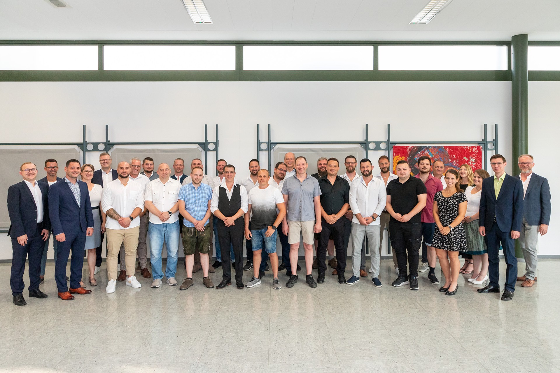 Freuen sich gemeinsam über den Erfolg: Die erfolgreichen Teilnehmenden des 34. Chemikantenlehrgangs mit Vertretern von WACKER und dem BBiW.