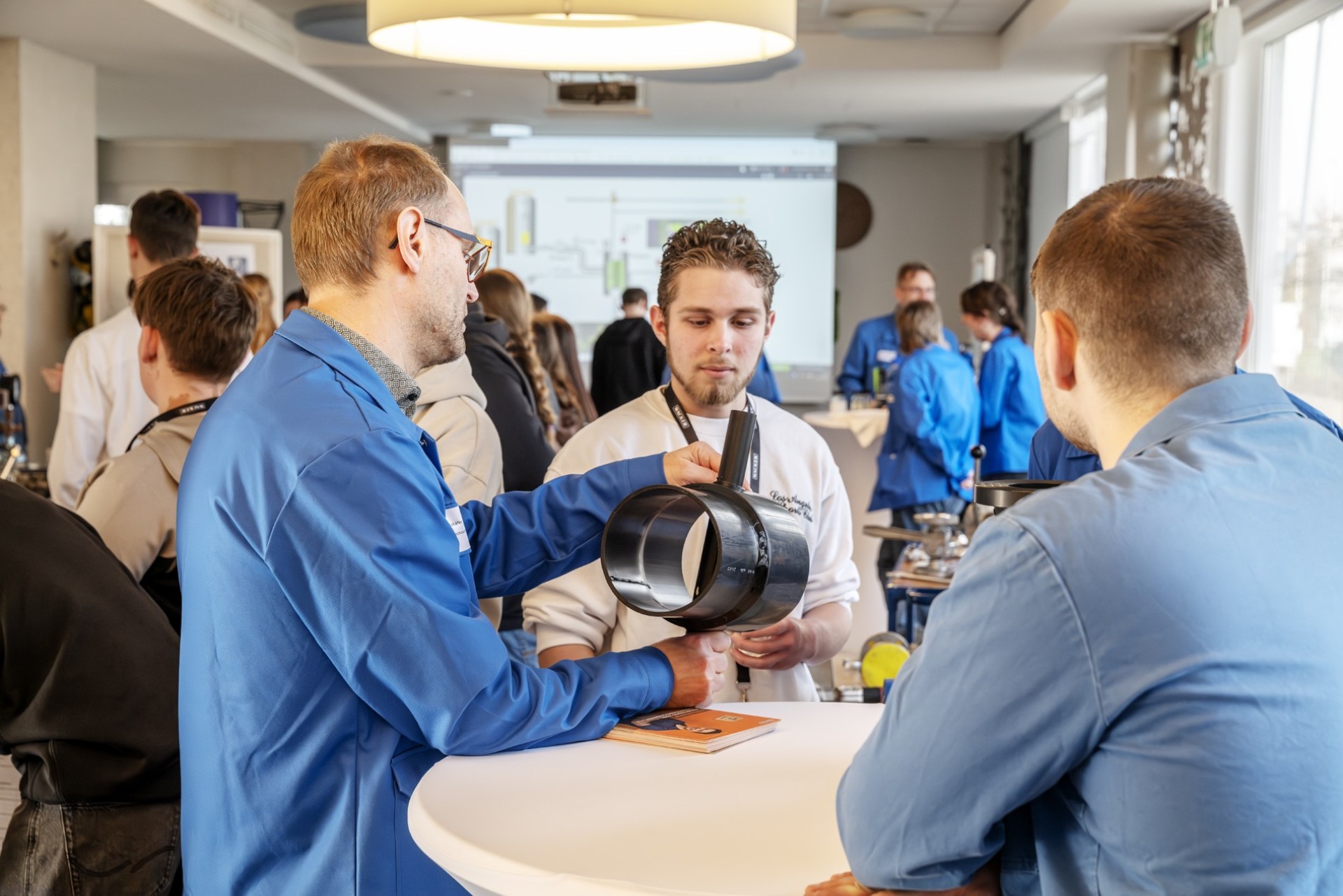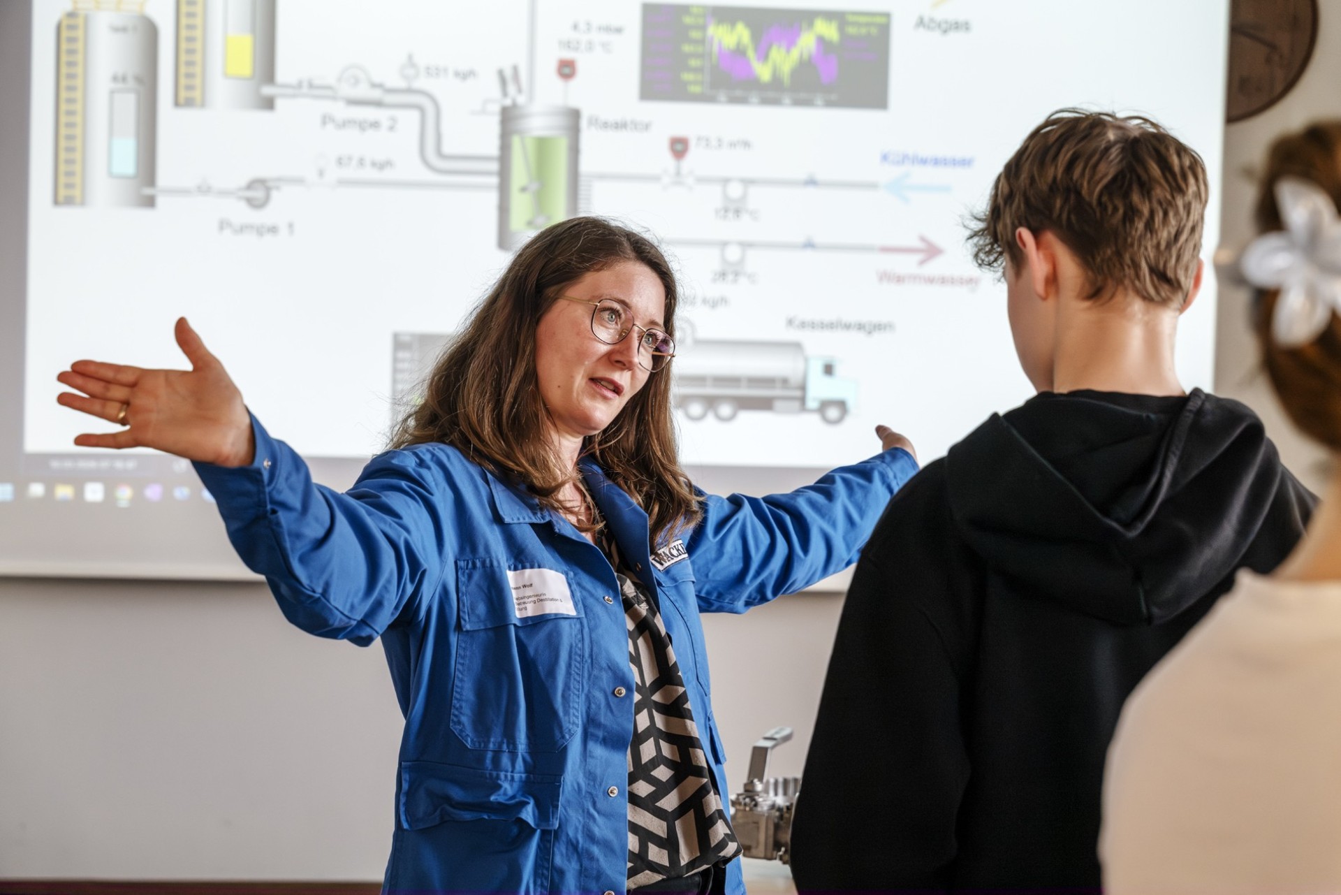 Die Jugendlichen lernten eine Auswahl an Studien- und Ausbildungsberufen kennen – vom Elektroingenieur und Verfahrenstechniker bis hin zum Chemikanten und Chemielaboranten. Dabei konnten sie erleben, was diese Tätigkeiten im Arbeitsalltag bedeuten. Nach kurzen Einführungen fanden die Teilnehmenden leicht Anschluss an Auszubildende und Mitarbeitende, die aus ihrem Arbeitsalltag erzählten und offen Fragen beantworteten. Vorbereitete Praxisstationen machten die Berufe erlebbar: Hier beteiligten sich die Jugendlichen selbst und führten unter Anleitung erste einfache Arbeitsschritte aus. Der Austausch und das Erleben lieferten ihnen reale Einblicke ins Arbeitsleben.