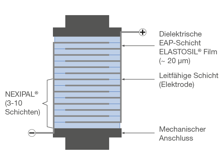 NEXIPAL® Laminate für elektroaktive Anwendungen bestehen aus einem bis mehreren ultradünnen Siliconlagen ELASTOSIL® Film. Diese nur 10 bis 400 µm dünne Folie wird mit speziellen Elektroden beschichtet, laminiert und in Form geschnitten. Mehrere Lagen werden anschließend übereinandergeschichtet.