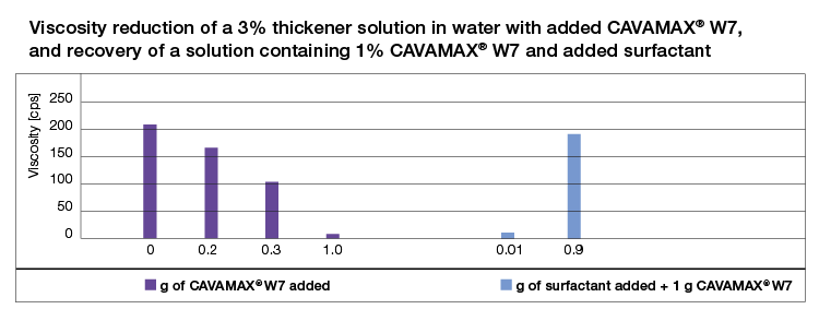 Es ist bekannt, dass HEUR-Verdicker mit den Cyclodextrinen CAVAMAX® und CAVASOL ® in Wasser gelöst werden können, um eine niedrigviskose, pumpbare und VOC-freie wässrige HEUR-Lösung herzustellen. Diese Viskositätserniedrigung wird durch die Zugabe der Lösung zur fertigen Farbe aufgrund der darin enthaltenen Tenside wieder vollständig aufgehoben.