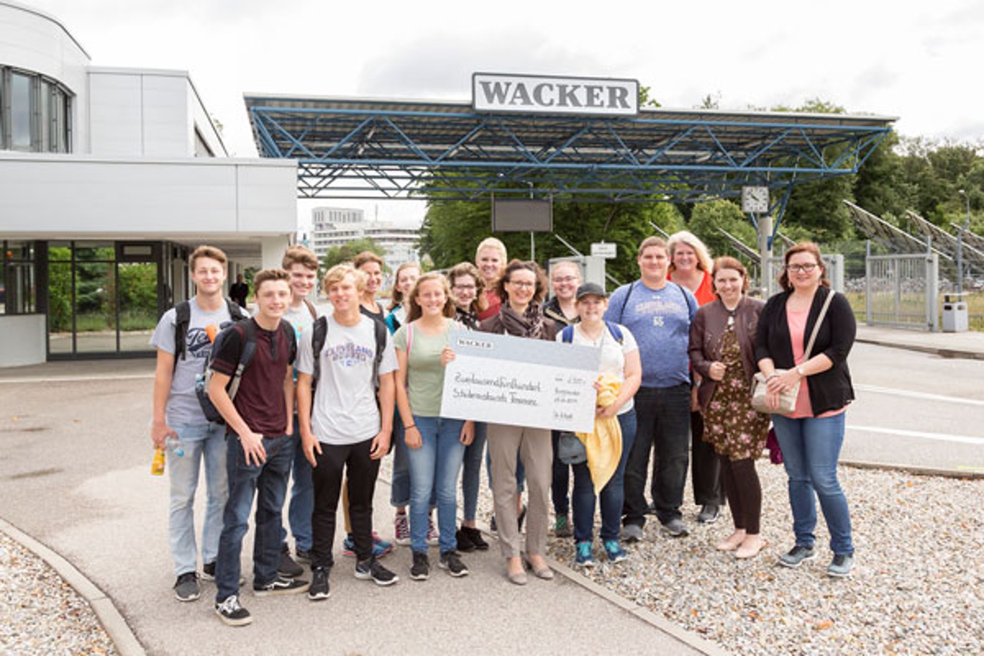 WACKER unterstützt das Austauschprogramm in diesem Jahr mit einer Spende von 2.500 Euro. Bei dem Werkbesuch überreichte Silvia Pfeifer von der WACKER-Standortkommunikation (Mitte) den symbolischen Scheck vor der Pforte Süd.