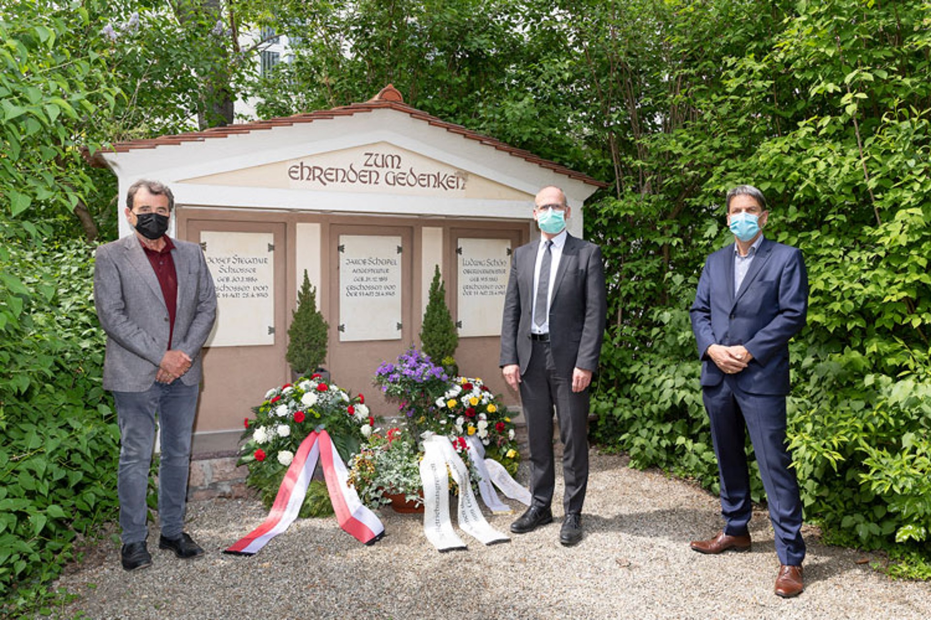 Mit gebührendem Abstand und mit Mund-Nase-Schutz ausgestattet, zollten WACKER-Werkleiter Dr. Dieter Gilles, und Betriebsrat Peter Áldozó umso mehr Hochachtung und Respekt für das mutige Handeln des Oberwerkmeisters Ludwig Schön, des Schlossers Josef Stegmair und des Angestellten Jakob Scheipel. Sie würdigten deren verantwortungsvollen Einsatz für den Schutz des Werks und die Lebensgrundlage ihrer Kollegen und Mitbürger. Bürgermeister Hans Steindl fand in seiner Gedenkansprache mahnende Worte der Erinnerung und legte für die Stadt Burghausen einen Kranz zum Gedenken an die Erschossenen nieder.
