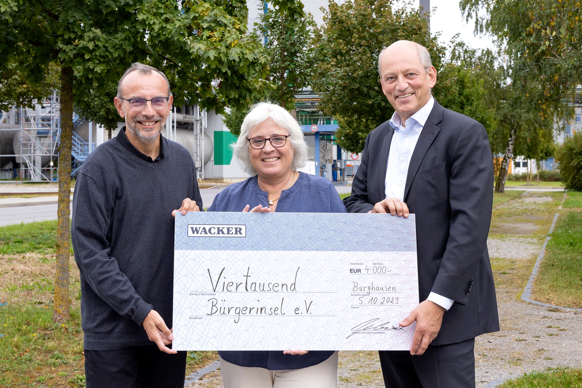 Foto (Wacker Chemie AG): Den symbolischen Spendenscheck nahmen (v.l.) Michael Schneiderhan und Heike Maser von Werkleiter Dr. Peter von Zumbusch entgegen.