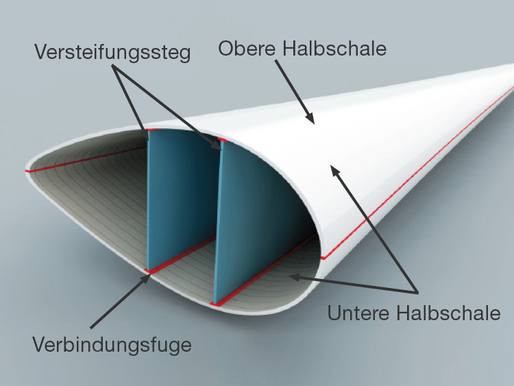 Zur Herstellung der Rotorblätter werden Halbschalen aus unterschiedlichen Materialien verklebt.