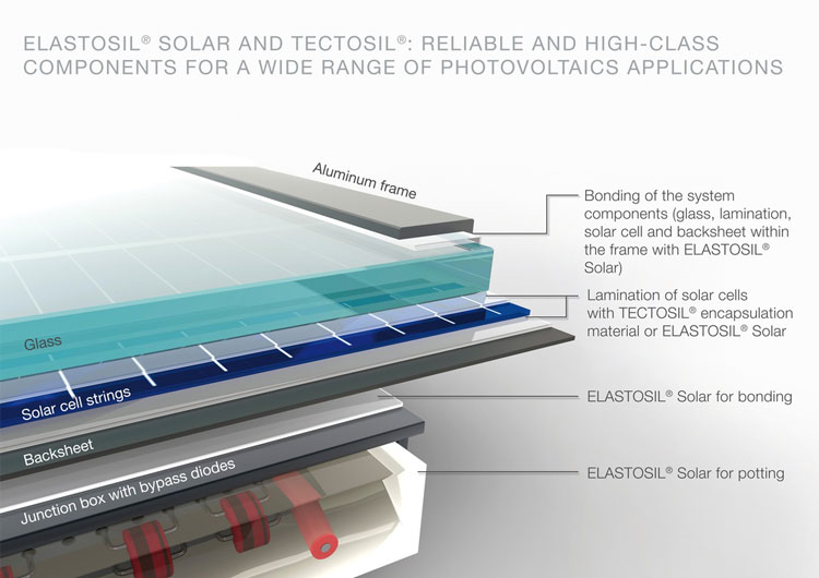ELASTOSIL® Solar Siliconkautschuk eignet sich optimal zum Einkleben von Solarzellenlaminaten in den Aluminiumrahmen. Auch beim Fixieren von weiteren Bauteilen, wie zum Beispiel den Anschlussdosen auf der Rückseitenfolie, zeigt ELASTOSIL® Solar eine starke Performance.