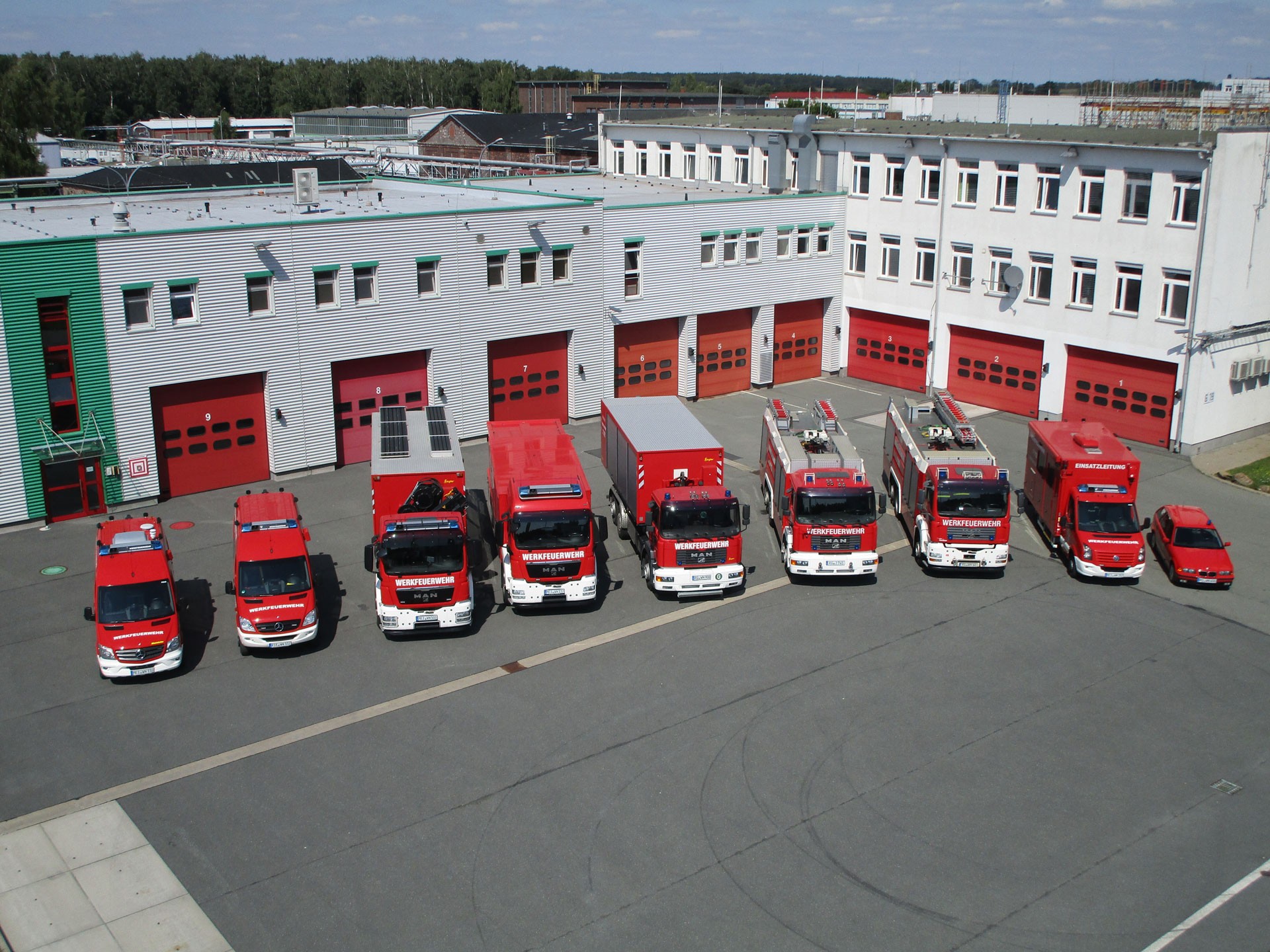 Die Einsatzwagen der Werksfeuerwehr der Wacker Chemie AG Nünchritz stehen für die Jahresgroßübung bereit.