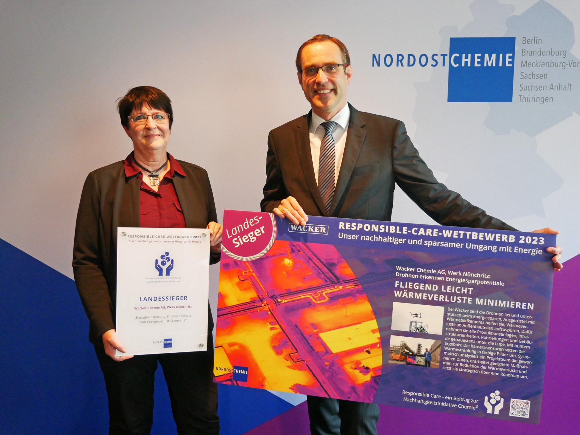 Der WACKER-Standort Nünchritz hat den Responsible-Care-Preis des VCI-Landesverbandes Nordost erhalten. Werkleiterin Dr. Jutta Matreux nahm bei der Mitgliederkonferenz des VCI Nordost die Auszeichnung entgegen. Damit würdigt der Chemieverband das nachhaltige Konzept „Drohneneinsatz zum Energieverlust-Screening“. Es dient dazu, Energie in der Verbundproduktion am Standort Nünchritz effizient und nachhaltig einzusparen.