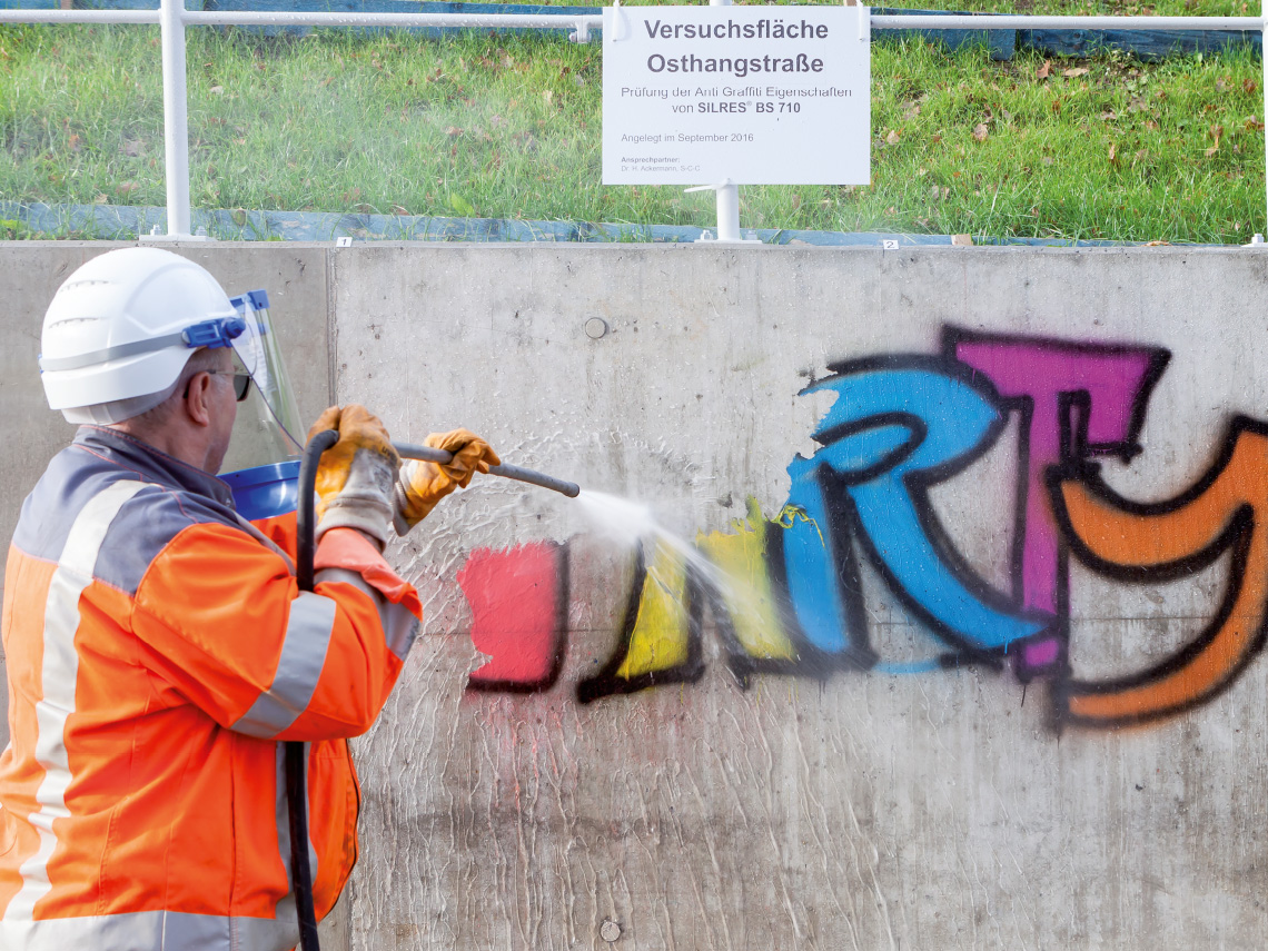 SILRES® BS 710 verbindet zwei hervorragende Eigenschaften für Graffiti-Schutz: Der Siliconkautschuk haftet ausgezeichnet auf unterschiedlichen mineralischen Untergründen. Besonders geeignet sind Beton, Ziegel, Putz, Sandstein, Kalksandstein und Naturstein. Und er bildet einen stark abhäsiven Film aus, auf dem Sprühfarben oder Plakatkleber kaum haften können. Das liegt daran, dass Silicone eine sehr viel niedrigere Oberflächenspannung als Sprühfarben oder Plakatkleber haben. Mit einer Vorbehandlung mit einem geeigneten Grundierungsmitteln ist auch der Schutz von nicht mineralischen Substraten wie Plastik, Glas oder unbeschichtetes und beschichtetes Metall möglich.