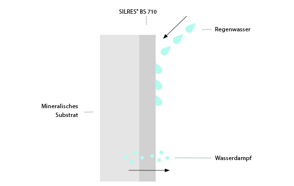Dieser Wert liegt unterhalb der sd-Werte herkömmlicher Polyurethanbeschichtungen gleicher Schichtdicke. Formulierungen auf Basis von SILRES® BS 710 sind diffusionsoffen und blockieren den Feuchteaustausch an Fassaden nicht.
