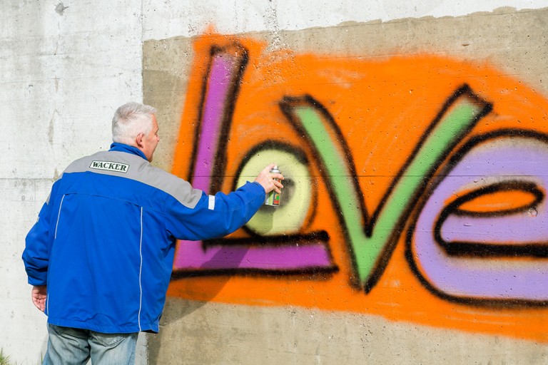 Ein Techniker besprüht eine unverputzte Testwand im Burghauser WACKER Werk mit einer handelsüblichen Farbe, wie sie auch von Graffiti- Sprayern verwendet wird.