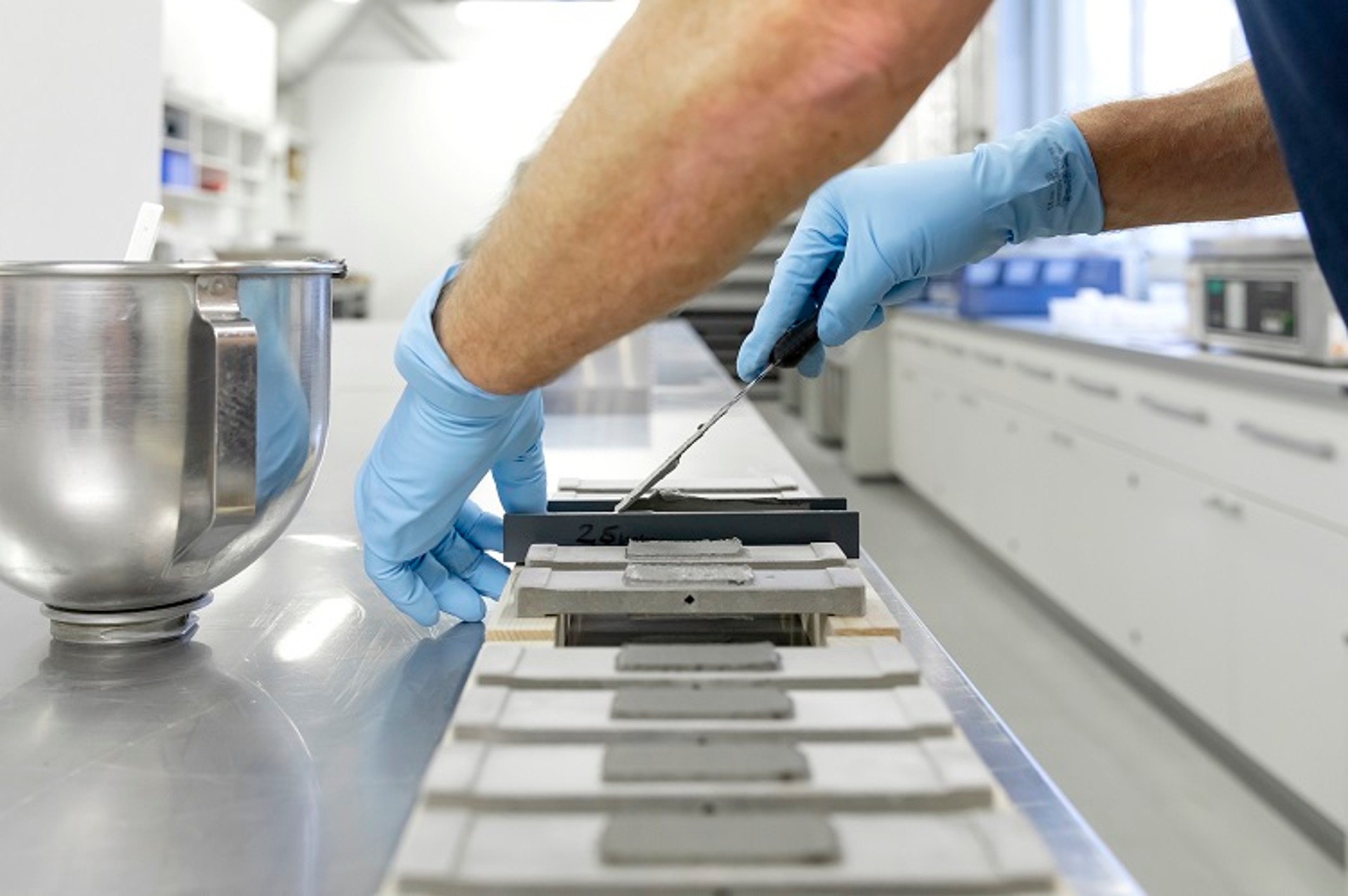 Für den Test zur Rissüberbrückung nach EN 14891 wird die Dichtungsschlämme auf eine definierte Schichtstärke gezogen. (Foto: Wacker Chemie AG)