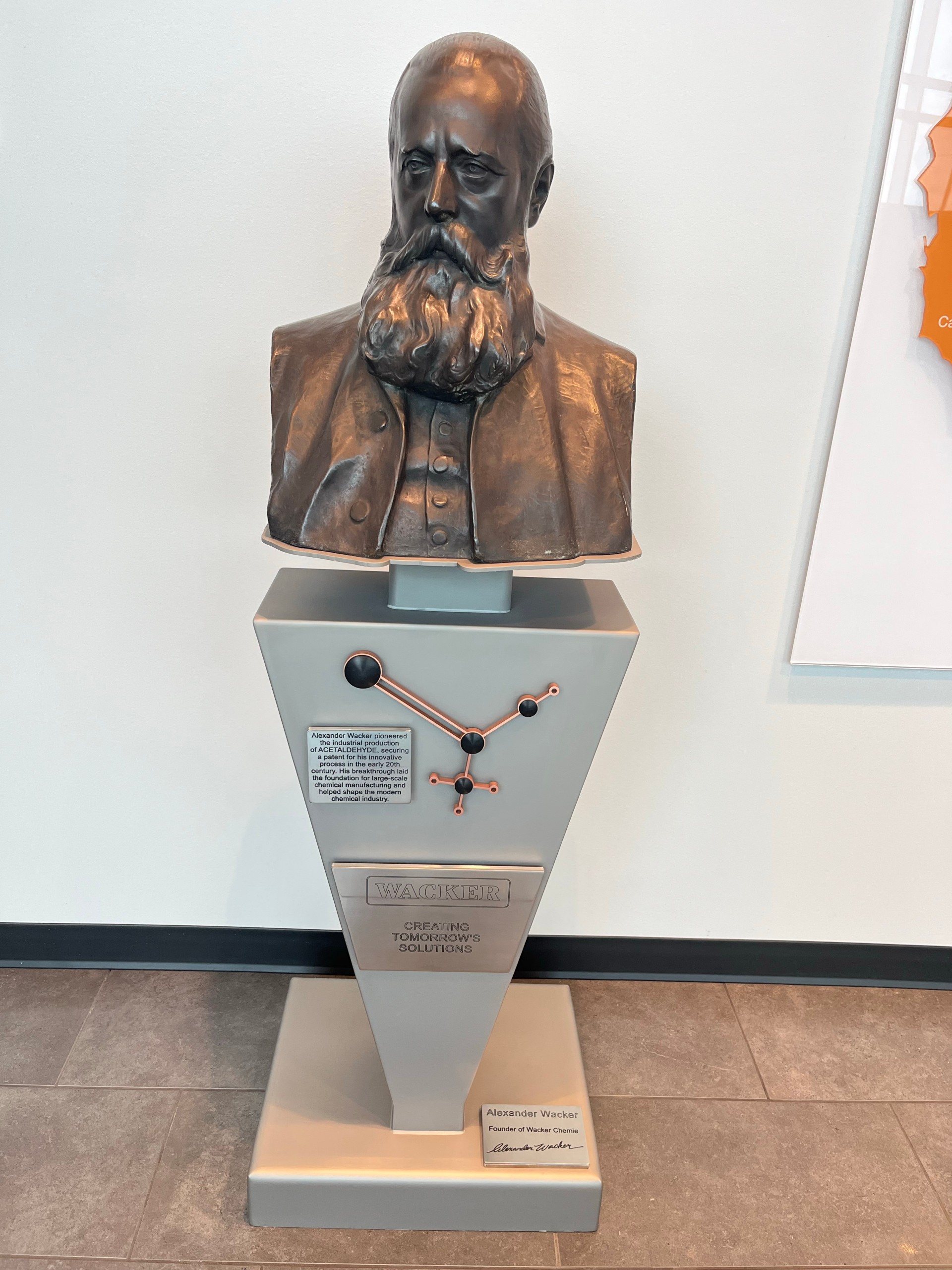 The bust of WACKER founder Alexander Wacker — formerly displayed at the company’s global headquarters in Munich — now resides in The WACKER Commons in Cleveland, Tennessee. Gifted to inspire future tradespeople, its hand-crafted base, made by Charleston team members, honors local craftsmanship and innovation. (Source: WACKER)