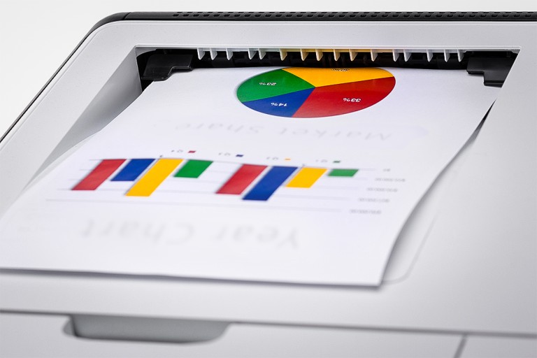 Laser printer in use: the advantages of this technology include high-speed printing and low costs.
