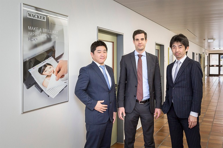 Paying a visit to Burghausen: Takayoshi Miyatani (left; sales director at Clariant Japan) and Daisuke Harada (right; technical sales manager at Clariant Japan), alongside Dr. Ingmar Piglosiewicz (head of WACKER’s technical marketing for HDK®).