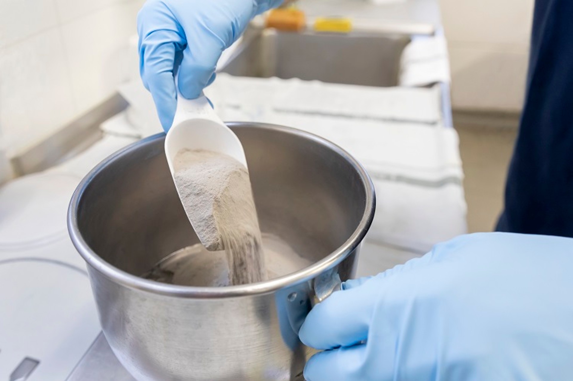 The polymer-modified dry-mix mortar is redispersed with water at WACKER’s applications laboratory. (Photo: Wacker Chemie AG)