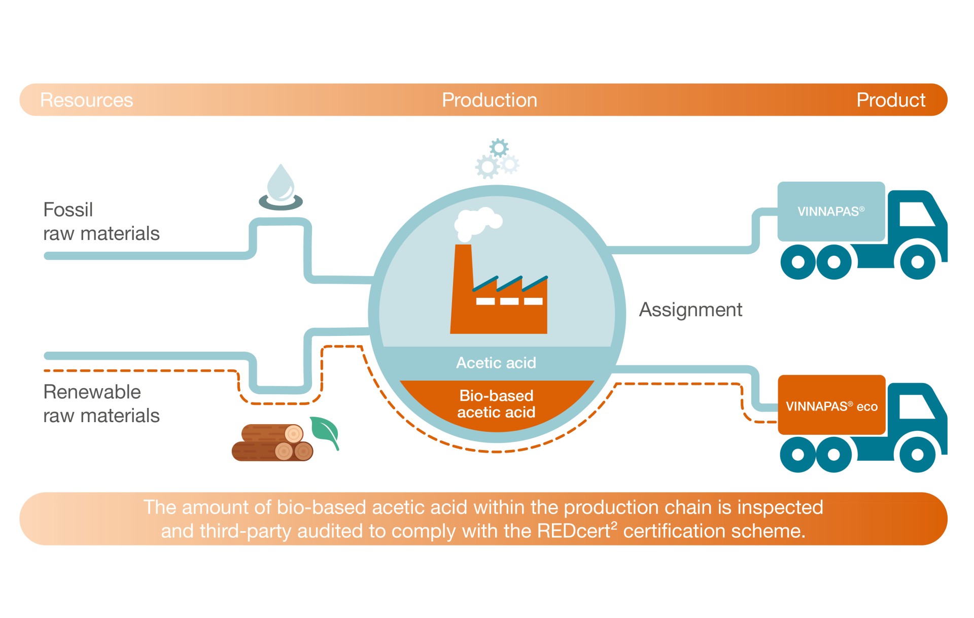 The biomass balance approach involves mathematically assigning the raw materials used to the sales of individual products. The bio-based acetic acid used, for instance, is allocated in this way to fossil resources saving products, with the balance of the sales being allocated to other products based on the use of fossil derived raw materials, mathematically speaking. No new production facilities are required. Products comply with the REDcert² certification scheme and are audited by TÜV Nord as an external third party. When customers buy one of the resulting products, they receive a REDcert² certificate guaranteeing that the product saves fossil resources by using sustainably certified renewable raw materials in the value chain.