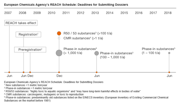 REACH is a European Union regulation about the Registration, Evaluation, Authorization and Restriction of Chemicals. By the end of May 2018, manufacturers and importers had to submit a dossier to ECHA (the European Chemicals Agency in Helsinki) on the manufacture, use and safety of each substance produced in volumes of 1 to 100 tonnes per year.
