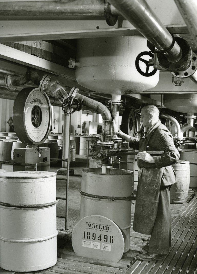 The success story of WACKER’s innovative binders now spans 75 years. In November 1937, the Burghausen site began producing VINNAPAS® Emulsion H60 – as it was then known – which is still produced today, only in a slightly modified version. The polymerization process used at WACKER – which, for the first time, made it possible to adjust the polymer emulsion’s viscosity as required – has been patented since April 1, 1938. VINNAPAS® H60 has been manufactured on an industrial scale ever since. In the beginning, around 25 metric tons of this dispersion left the site every month. WACKER chemist Dr. Herbert Berg developed the process, along with Herbert Mader and Martin Doriat. VINNAPAS® Emulsion H60, which was used in the formulation of wood glue, quickly became a bestseller. Wood glue is still a standard application of the VINNAPAS® product family, which has become very large and versatile. Just two short years after production started, WACKER was making over 40 metric tons of H60 dispersion each month. This grade was a so-called homopolymer, consisting of an aqueous polyvinyl acetate dispersion with a solids content of 60 percent (hence the name), which was stabilized by the addition of polyvinyl alcohol as a protective colloid. WACKER had already gathered experience in the manufacture of polyvinyl acetate prior to developing the polymerization process that it patented in 1938. In 1924, Dr. Willy O. Herrmann created the technological foundation at the Consortium, the company’s central research facility in Munich, by developing a procedure for the manufacture of vinyl acetate monomer by addition of acetic acid to acetylene. Production reports of that time soon referred to this liquid monomer as “Vinna” – a first hint at what would later become the VINNAPAS® brand name.