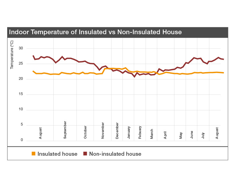 We spend over 90% of our lives inside buildings. ETICS reduces the impact of summer heat waves. In the Dubai study, air conditioners in both houses were preset to an interior air temperature of 23 °C. In the insulated house, the temperature remained more constant, creating a pleasant living environment. The temperature inside the non-insulated house repeatedly increased to 28 °C.
