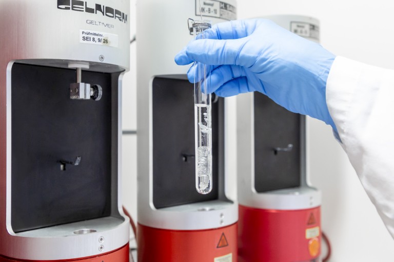 Measuring gel time: the reactivity of WACKER silicone resins is measured in a lab. Graphs of these data can be found below.