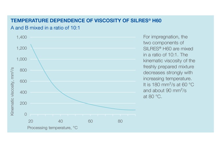 The two components are mixed in a ratio of 10:1 for processing. The viscosity of the mixture depends greatly on temperature (see chart, top right): at 25 °C, the kinematic viscosity is about 1,000 mm²/s, and drops by a factor of 10 when heated to 80 °C. This effect is used in the impregnation process. Both the resin and the winding are preheated to minimize the resin’s viscosity and ensure it penetrates rapidly into the winding during impregnation. In practice, the temperature is usually maintained at 60 °C.