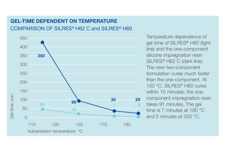 This allowed a silicone impregnation resin to be developed with a curing rate comparable to that of organic impregnation resins. The curing time depends greatly on the temperature (see chart, top left). Gel time at 150 °C is thus about 15 minutes. At this temperature, the material is fully cured after six hours. At 180 °C, the gel time drops to five minutes and curing takes just two and a half hours.