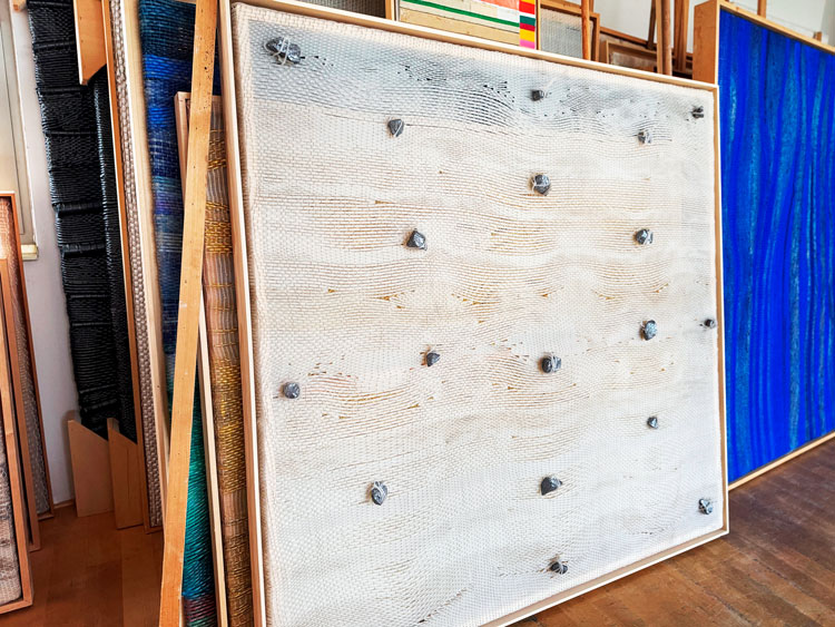 Most recently, the weaving artist has been working on the mother project of her art form: “Von Silicon zu Silicon” (from silicone to silicone). The flexible, soft silicone tubes lie close together in the frame – either in straight lines or waves. On the surface of the piece, fine silicone tubes entwine a small gray-black chunk of silicon metal – thus, from silicone to silicone. “I’m not yet sure that I’m happy with it,” says the artist, critically evaluating her work in her studio. She grasps the fine silicone tubing on the table in front of her again and again – touches it, feels it. Maybe it needs smaller “silicon metal chunks,” she wonders out loud. A typical moment for Fioreschy – she does not describe herself as “ever searching” for nothing.