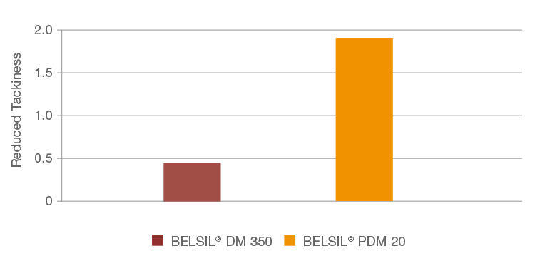The graph shows a tackiness comparison with a skin care cream containing dimethicone and trimethylsiloxyphenyl dimethicone: Low-viscosity silicones (e.g. BELSIL® DM350) reduce tackiness. Phenyl-modified silicones (e.g. BELSIL® PDM 20), can even improve performance properties.
