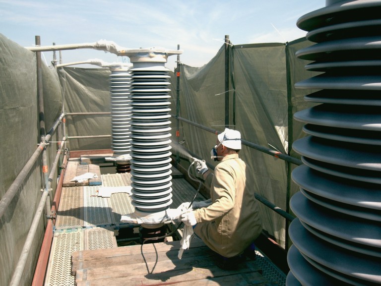 Instead of being completely replaced, insulators can be refurbished using specially-formulated silicone coating solutions, which are sprayed onto the ceramic bodies as emulsions and form a protective silicone film. Not only are the coatings excellent insulators, they are also exceptionally hydrophobic – water-repellent. When rain touches the silicone surface it beads into separate droplets. This precludes the formation of a conductive film and prevents the typical flashover scenario caused by a wet film layer. Moreover, the silicone coatings are highly resistant to tracking and arcing.
