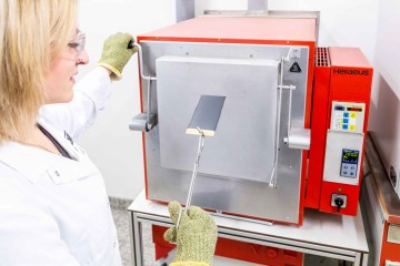 Sabine Hanke tests a black coating example formulation applied to sheet steel in the laboratory oven to see what temperatures silicone resin coatings can withstand.