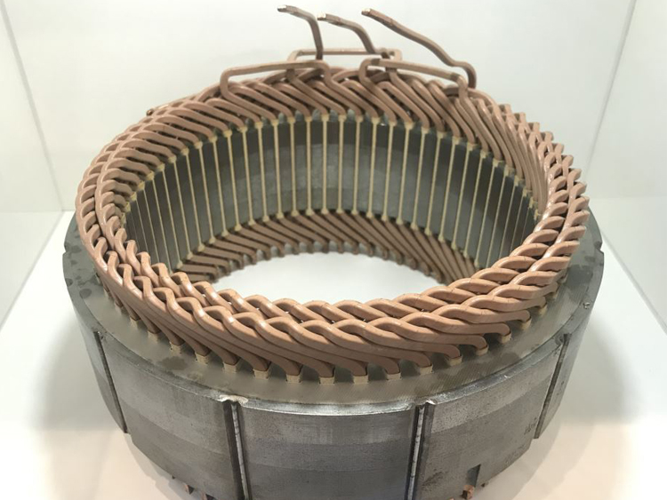 绕组可用不同材料被绕制成各种形状,传统的方法是采用圆铜线,生产工艺相当复杂。目前的发展趋势,是运用发夹式绕组技术,将横切面为矩形的细铜丝段,绕成线圈,并将这些线段折成发夹状,嵌入叠片铁芯的封接槽,然后再按照一定的样式进行焊接。发夹式绕组技术是实现快速工业化生产的理想选择。