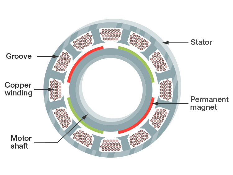 在传统汽车中,行车所需扭矩是内燃机提供的,而电动汽车使用的是三相电流电机。这种电机结构紧凑,重量轻,但性能极为出色。它们几乎全部采用内转子结构:转子被安装于电机轴,并在中空的定子内旋转——定子(即,静止部分)被固定于电机壳体,转子在壳体内旋转,壳体通常采用主动式冷却。