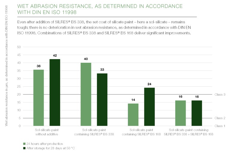 对用SILRES® BS 338新型有机硅添加剂改性的硅溶胶硅酸盐涂料进行的实验室测试表明,它的耐湿磨性与未经这种添加剂改性的参照涂料大体相同。参加SILRES® BS 338研发工作的Sebald先生介绍说:“尤其在与SILRES® BS 168(一种用于调整硅酸盐涂料pH值的著名产品)结合使用时,SILRES® BS 338可显著提高涂料的机械强度。”